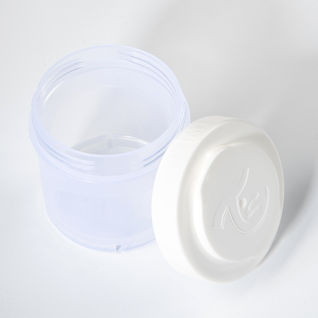 Contenedor inteligente para polvo: Apilable, ideal para preparar las tomas con antelación y conservarlas fácilmente.