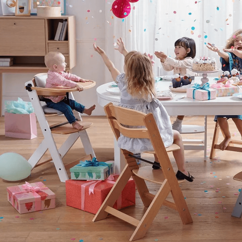 Fabricada en resistente madera natural y con un diseño moderno, combina seguridad, confort y funcionalidad. Esta silla se transforma fácilmente de silla alta para bebé, a silla para niño y luego a silla juvenil, adaptándose a las etapas del desarrollo. Con su arnés de seguridad de 3 puntas y su bandeja desmontable, tu guagua podrá comer, jugar y compartir contigo de forma segura y cómoda.